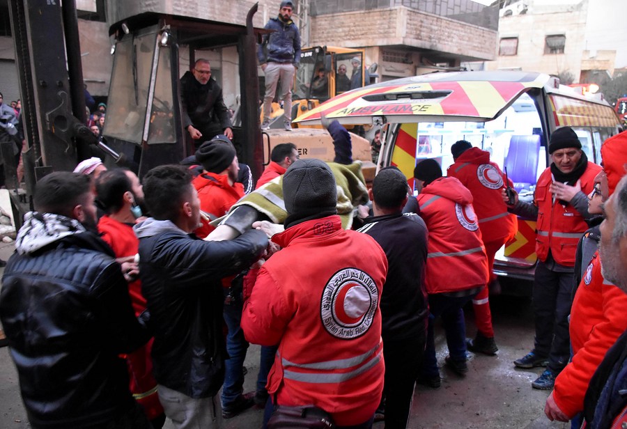 Rescue work is in progress after a deadly earthquake in Hama province, central Syria, Feb. 6, 2023. (Str/Xinhua)