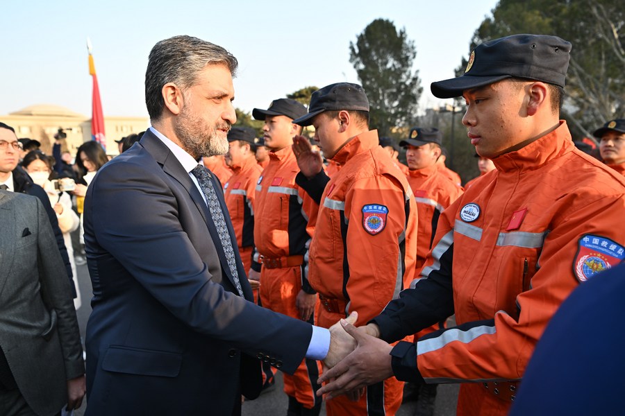 Turkish Ambassador to China Abdulkadir Emin Onen shakes hands with a member of a Chinese rescue team at Beijing Capital International Airport in Beijing, capital of China, Feb. 7, 2023. (Xinhua/Li Xin)