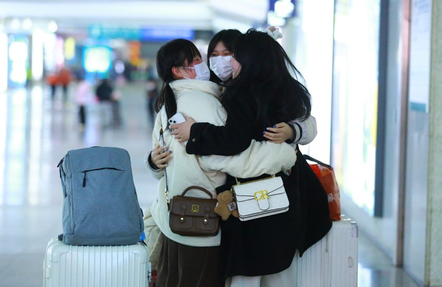 Friends hug to celebrate a reunion at the exit of the Nanchang Railway Station in Nanchang, east China's Jiangxi Province. (Photo/Lu Yao)