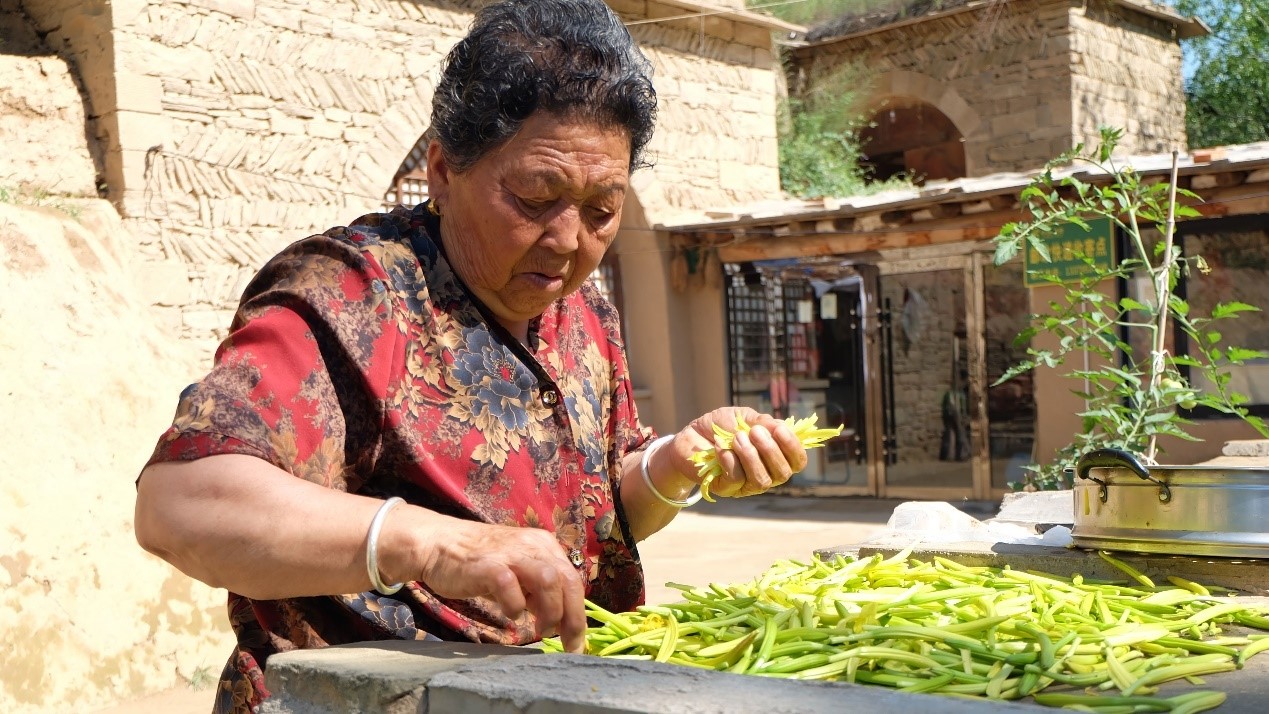 Photo taken on July 20, 2022, shows Liu Jinlian, a villager in Liangjiahe, picking daylilies. (People's Daily Online/Zhong Wenxing)
