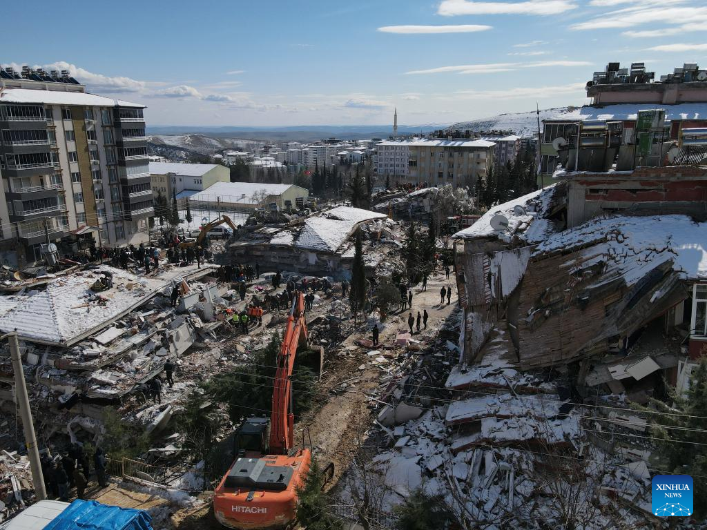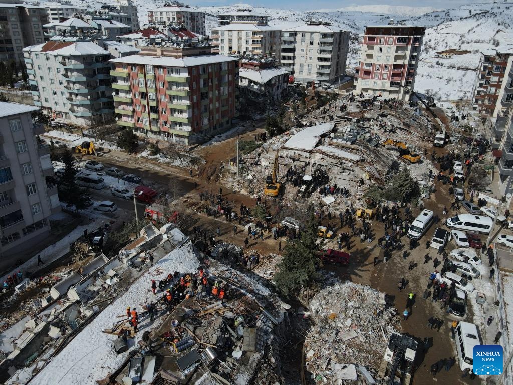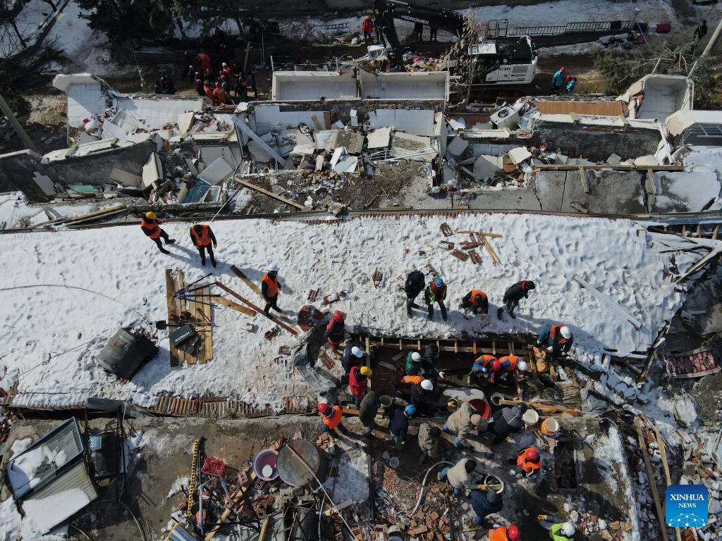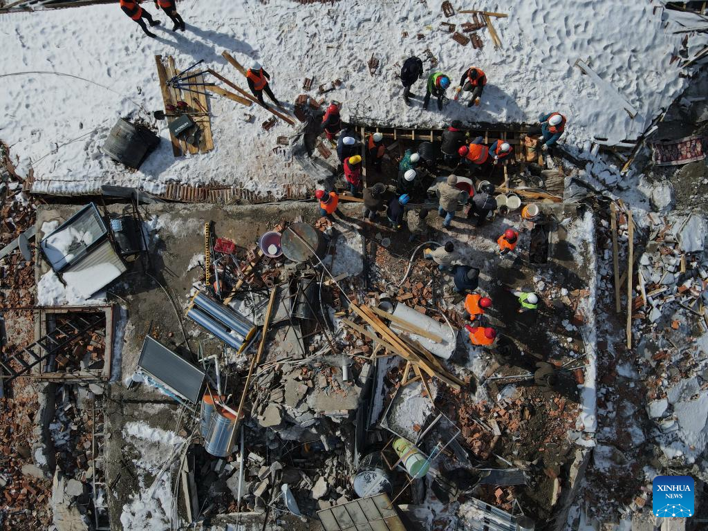 This aerial photo taken on Feb. 8, 2023 shows rescuers searching for survivors among the rubble of buildings destroyed in quake-hit Besni District of Adiyaman Province, Trkiye. Turkish President Recep Tayyip Erdogan said during his visit to the worst-hit region on Wednesday that a total of 8,574 people in the country have died from the massive earthquakes. Earlier, the country's disaster management agency said more than 40,000 people have been injured. (Photo by Mustafa Kaya/Xinhua)