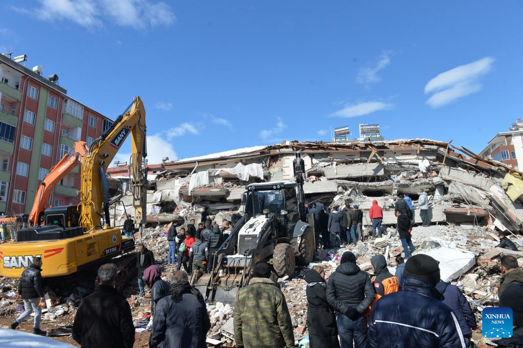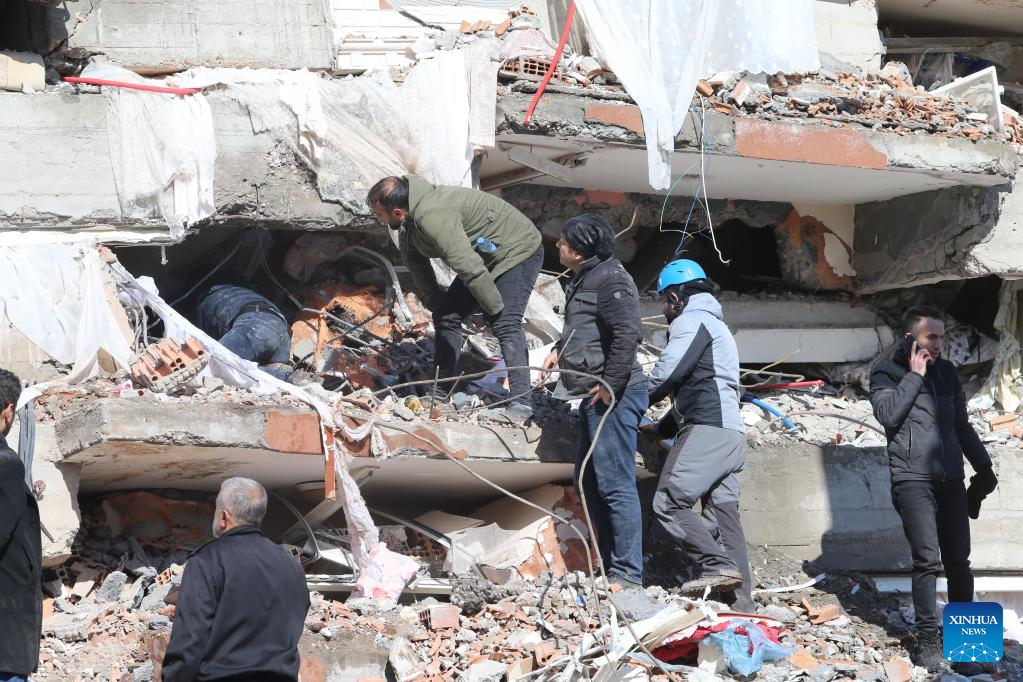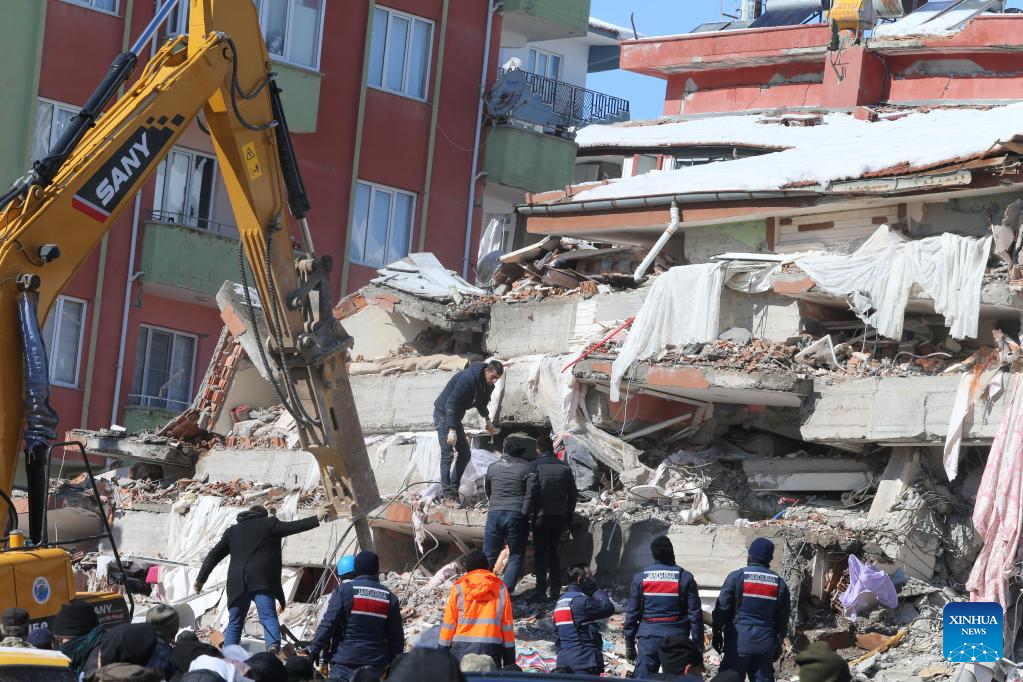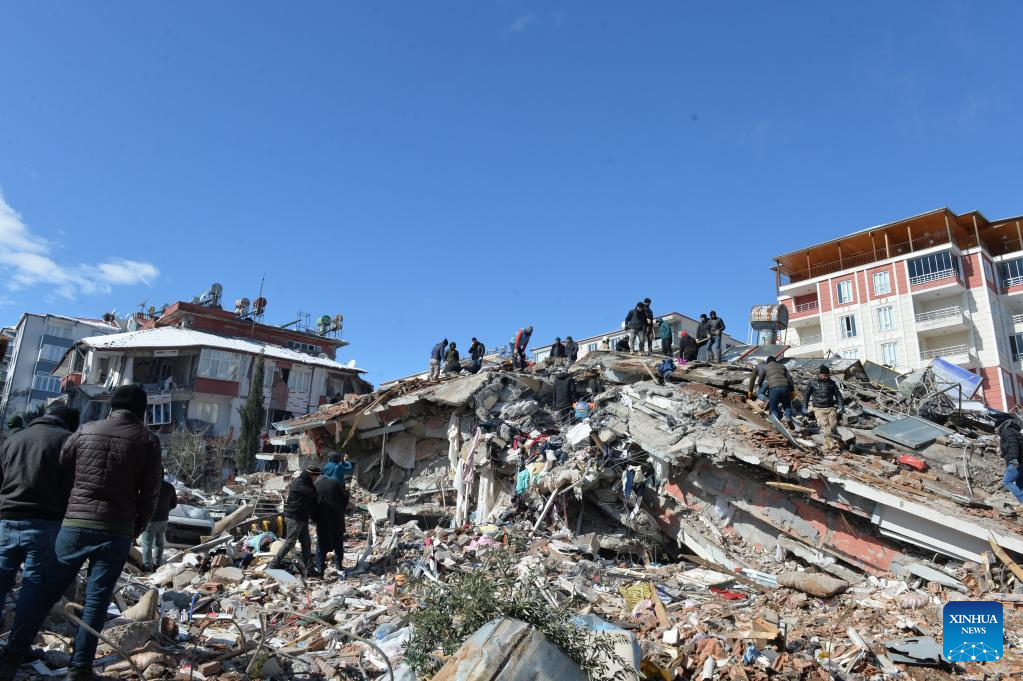 Rescuers search for survivors among the rubble of a building destroyed in quake-hit Besni District of Adiyaman Province, Trkiye, Feb. 8, 2023. Turkish President Recep Tayyip Erdogan said during his visit to the worst-hit region on Wednesday that a total of 8,574 people in the country have died from the massive earthquakes. Earlier, the country's disaster management agency said more than 40,000 people have been injured. (Photo by Mustafa Kaya/Xinhua)