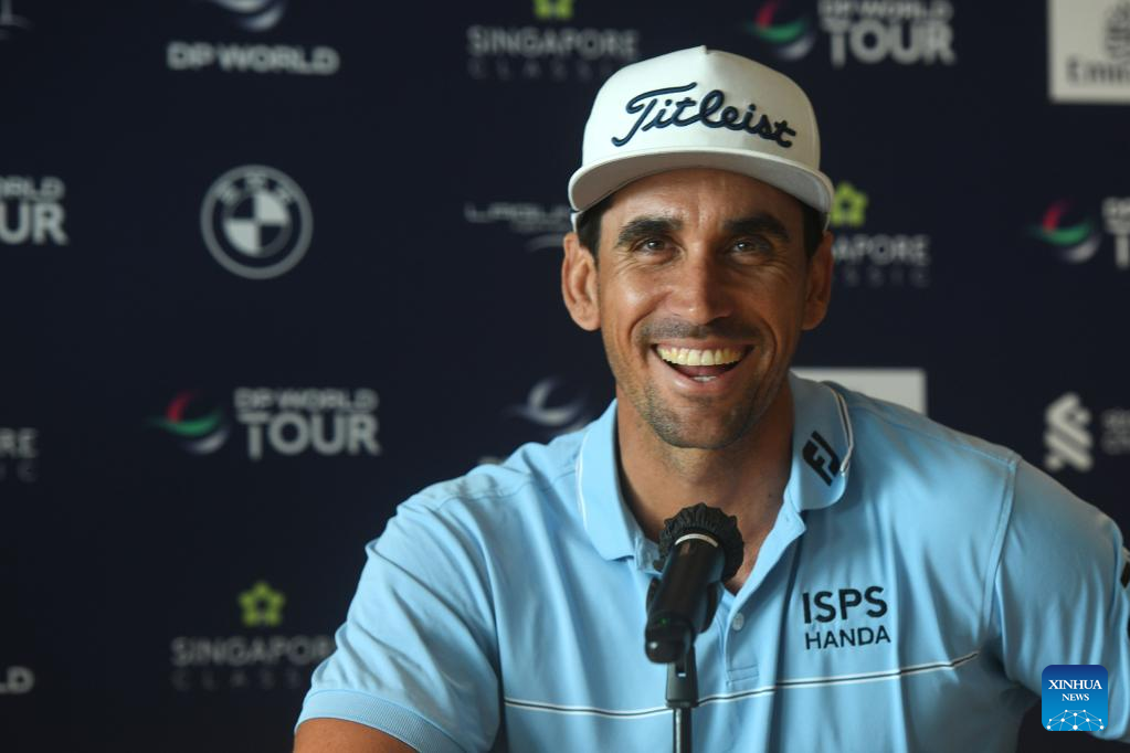 Rafa Cabrera-Bello of Spain attends the pre-event press conference of Singapore Classic golf tournament at Laguna National Golf Resort Club in Singapore, Feb. 8, 2023. (Photo by Then Chih Wey/Xinhua)