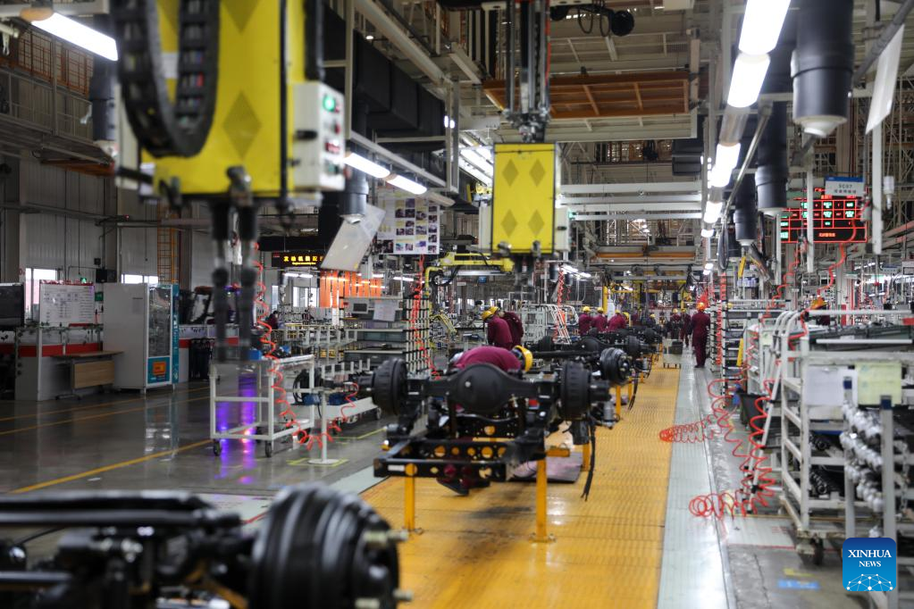 Employees work on a truck assembly line at a production base of Anhui Jianghuai Automobile Group Corp. Ltd. in Hefei, east China's Anhui Province, Feb. 8, 2023. (Xinhua/Liu Junxi)