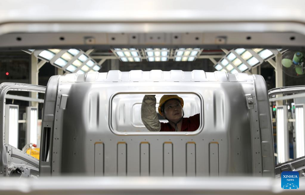 An employee works on a truck assembly line at a production base of Anhui Jianghuai Automobile Group Corp. Ltd. in Hefei, east China's Anhui Province, Feb. 8, 2023. (Xinhua/Du Yu)