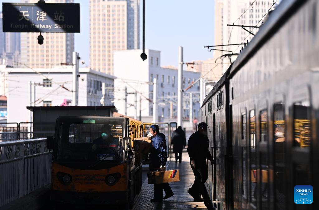 Staff members load packages at a platform of Tianjin Railway Station in north China's Tianjin, Feb. 8, 2023. As enterprises continue to resume work and production after the Spring Festival holiday, the volume of packages transported at Tianjin Railway Station sees a significant increase. There are about 60 trains at the station every day that can undertake package transportation. (Xinhua/Li Ran)