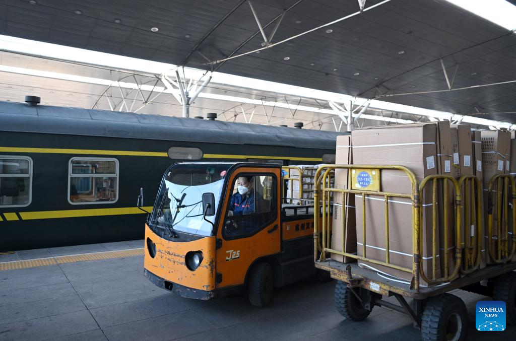 A staff member transports packages at a platform of Tianjin Railway Station in north China's Tianjin, Feb. 8, 2023. As enterprises continue to resume work and production after the Spring Festival holiday, the volume of packages transported at Tianjin Railway Station sees a significant increase. There are about 60 trains at the station every day that can undertake package transportation. (Xinhua/Li Ran)