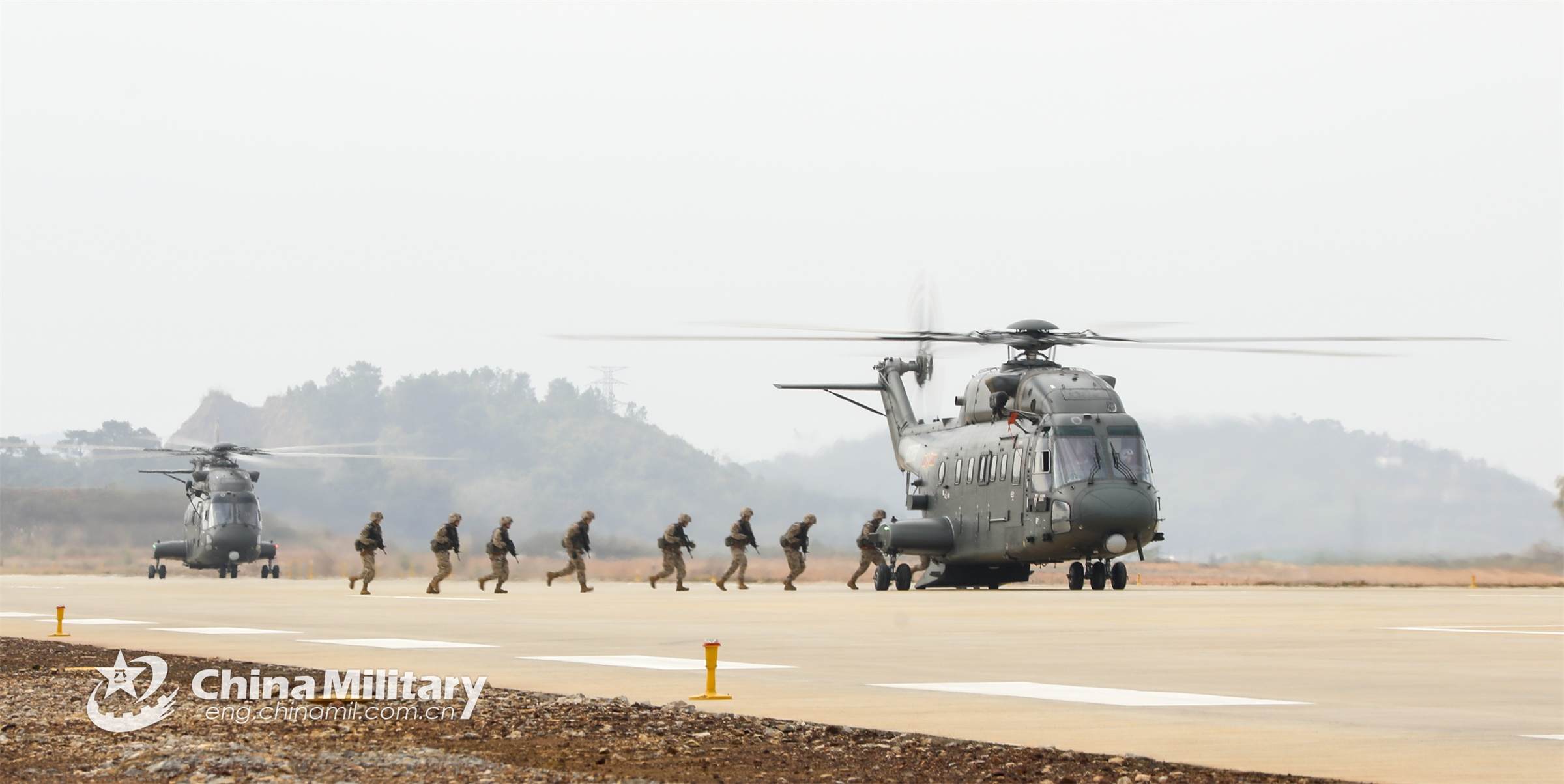 Soldiers assigned to an army brigade line up to board a helicopter during an air-ground training exercise recently. (eng.chinamil.com.cn/Photo by Sun Changyi)