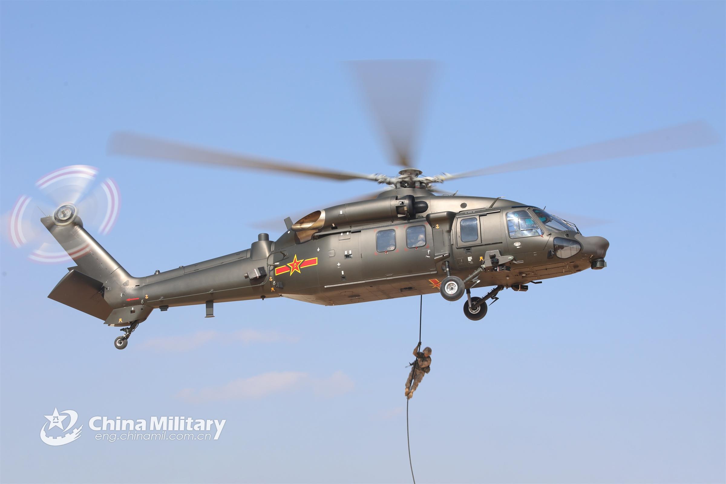 A soldier assigned to an army brigade fast-ropes down from a helicopter during an air-ground training exercise recently. (eng.chinamil.com.cn/Photo by Sun Changyi)