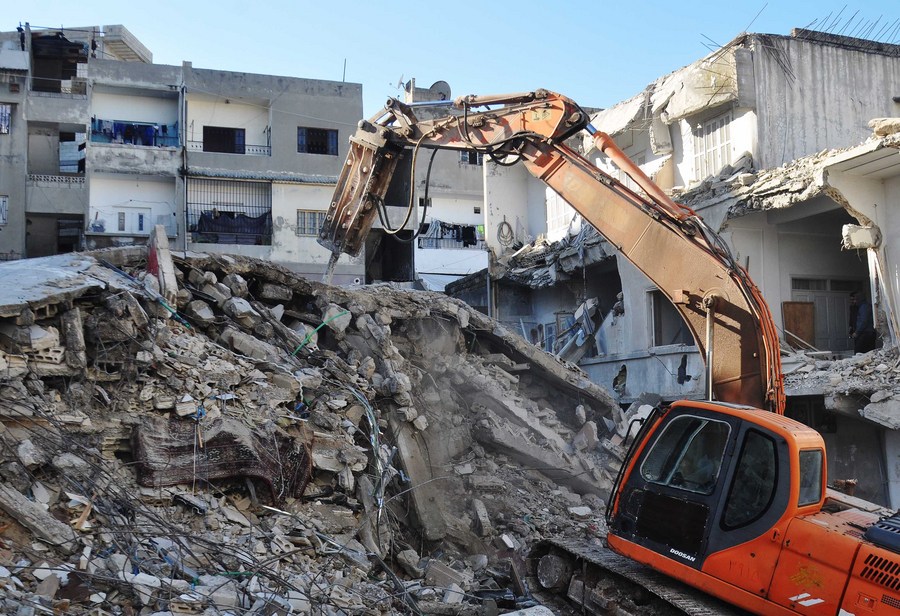 Rescue workers search for survivors among the rubble of a destroyed building in the Rihawi area in Latakia province, northwestern Syria, on Feb. 8, 2023. (Str/Xinhua)