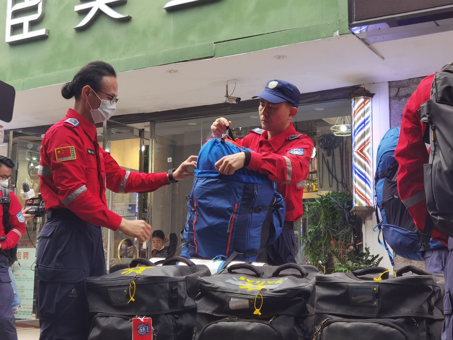 Rescuers of Shenzhen Rescue Volunteers Federation check equipments before departure in Shenzhen, south China's Guangdong Province, Feb. 8, 2023. (Xinhua/Mao Siqian)