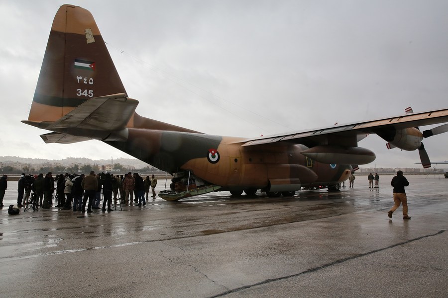 Humanitarian aid, including medical supplies and rescue items, are loaded onto a Jordanian military plane at the Marka military airport in Amman, Jordan, Feb. 8, 2023. (Photo by Mohammad Abu Ghosh/Xinhua)