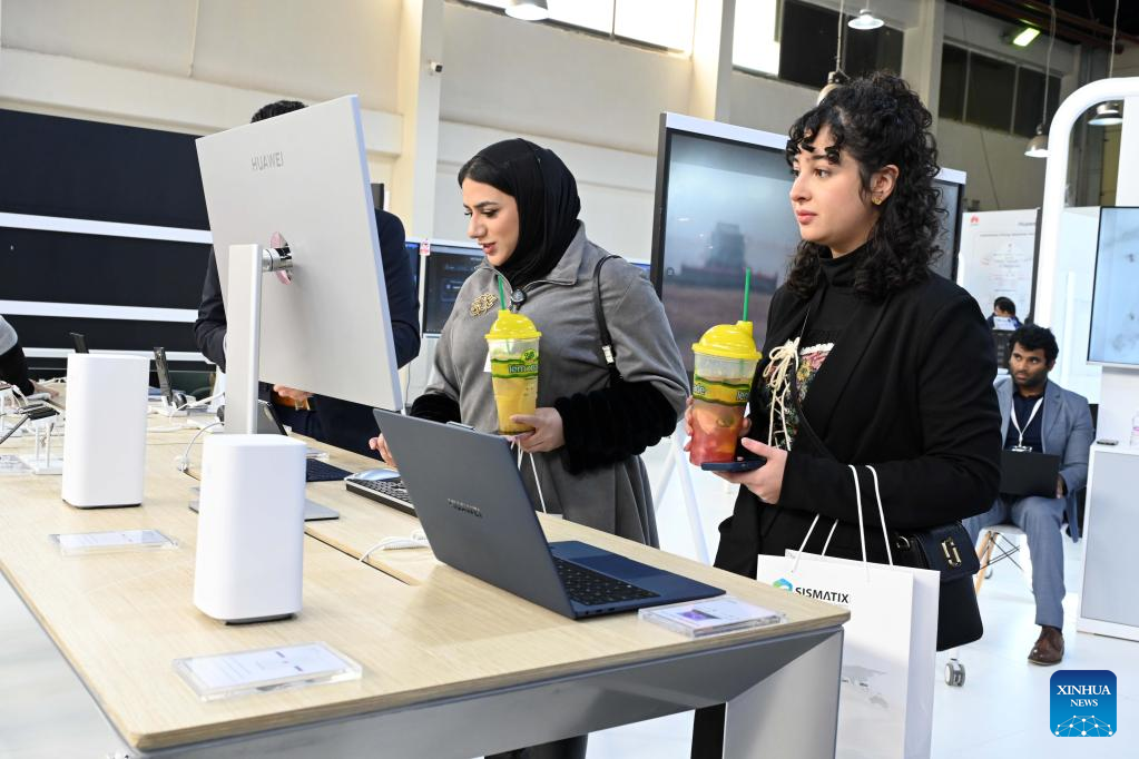 People visit Kuwait International Technology Exhibition in Hawalli Governorate, Kuwait, on Feb. 8, 2023. Kuwait International Technology Exhibition with the participation of over 80 entities kicked off here on Wednesday. (Photo by Asad/Xinhua)
