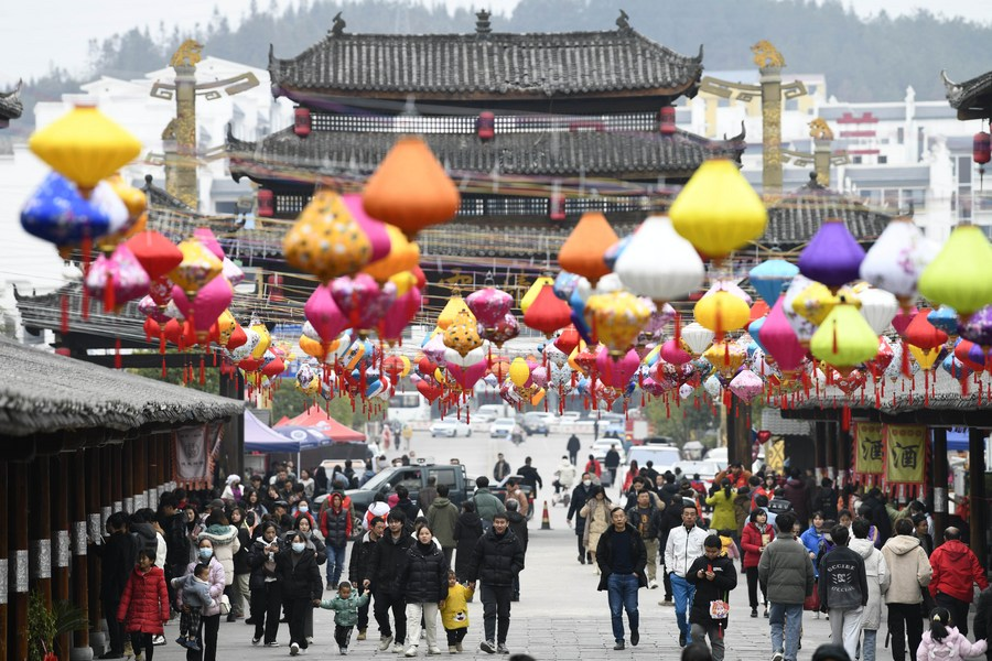 People tour Jiuzhou ancient town in Huangping County, southwest China's Guizhou Province, Jan. 26, 2023. (Photo by Wang Chao/Xinhua)
