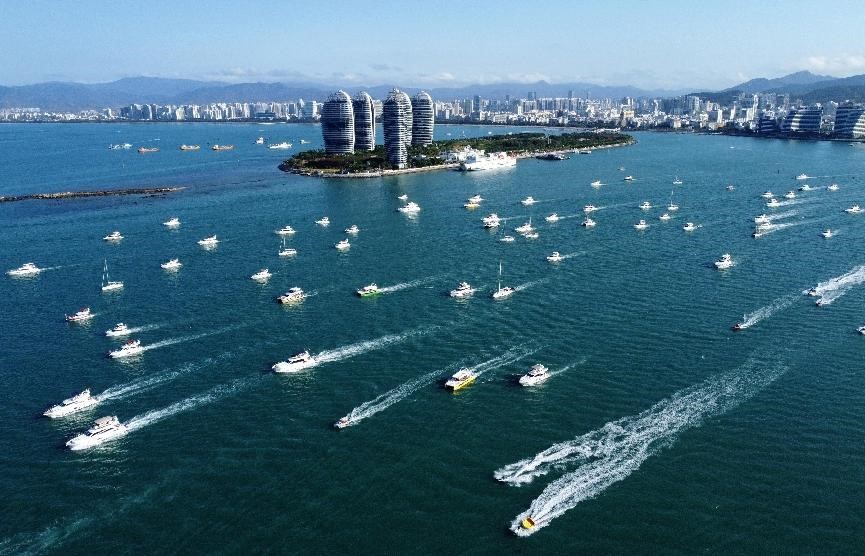 Yachts are seen sailing on the water in Sanya, south China's Hainan province, Feb. 7, 2023. (People's Daily Online/Ye Longbin)