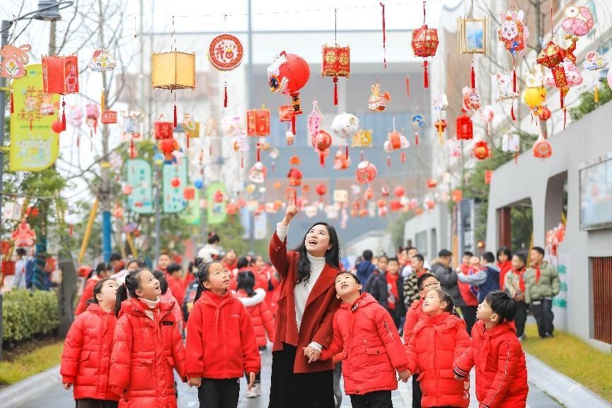 A teacher and her students watch homemade lanterns at an elementary school in Changxing county, Huzhou, east China's Zhejiang province, Feb. 6, 2023. (People's Daily Online/Zhou Hongfeng)