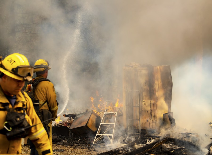 Firefighters attempt to extinguish a fire in the forests near Lake Tahoe in north California, the United States, on Sept. 9, 2022. Multiple forest fires took place due to hot and dry weather in California. (Photo by Dong Xudong/Xinhua)