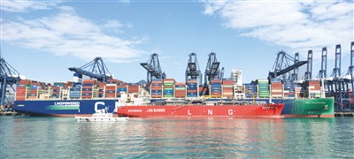 The world's largest LNG bunker vessel, “Hai Yang Shi You 301,” fills LNG for the dual-fuel container ship of CMA CGM CONCORDE at Yantian Port in Shenzhen city, south China’s Guangdong Province, Jan. 18, 2023. (People’s Daily Overseas Edition/Cheng Yuanzhou)