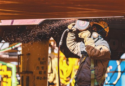 A worker is busy working on a large LNG carrier at the workshop of Samsung Heavy Industries (Rongcheng) Co., Ltd. in Rongcheng city, east China’s Shandong Province, Jan. 30, 2023. (Photo/Li Xinjun)
