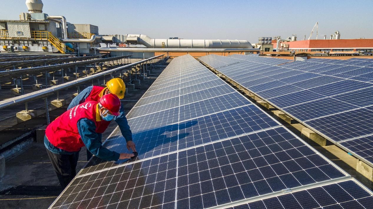 Employees of the Jindong power supply company under the State Grid maintains photovoltaic panels on the roof of a workshop in a factory in Jindong district, Jinhua, east China's Zhejiang province, Dec. 15, 2022. (People's Daily Online/Hu Xiaofei)