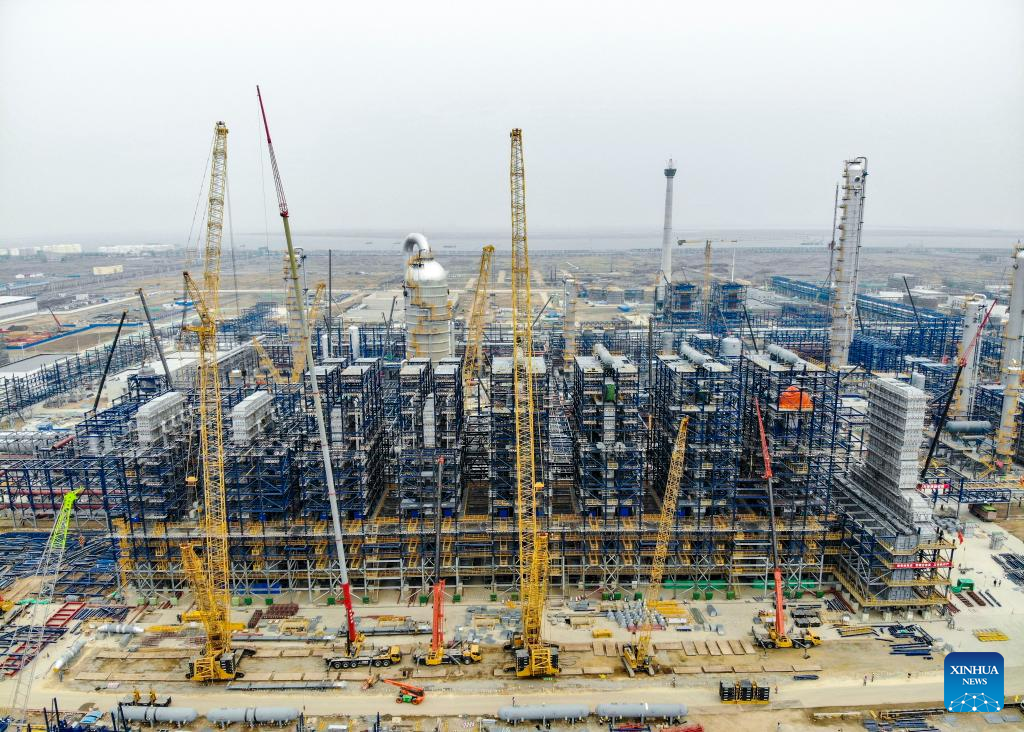 This aerial photo shows the construction site of an ethylene project in north China's Tianjin, Feb. 9, 2023. The total investment of the ethylene project, a key project in the 14th Five-Year Plan period (2021-2025), is more than 30 billion yuan (about 4.4 billion U.S. dollars). (Xinhua/Sun Fanyue)