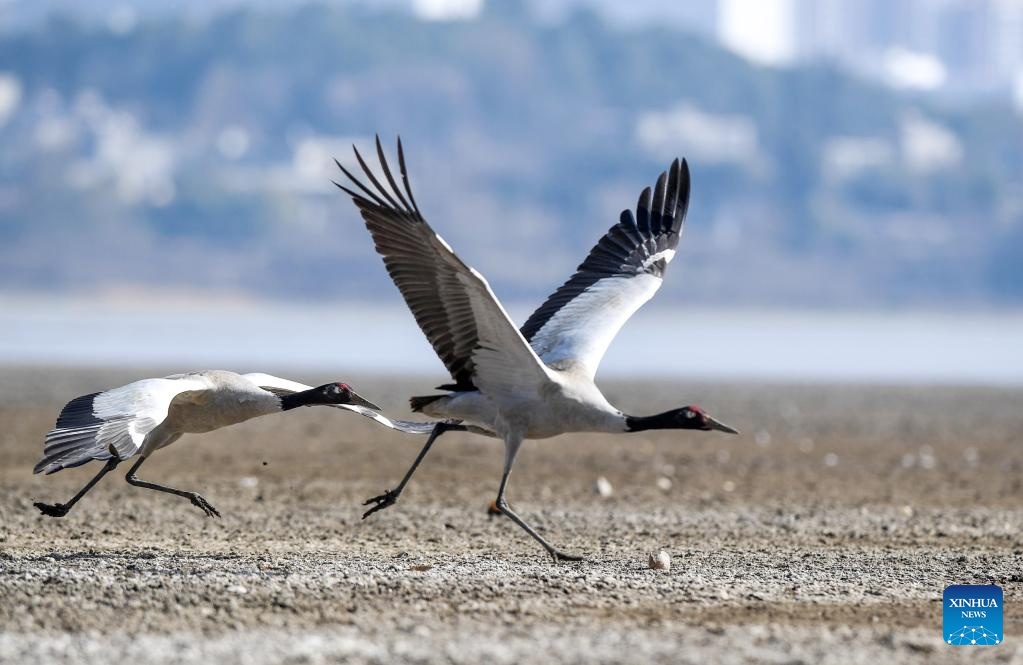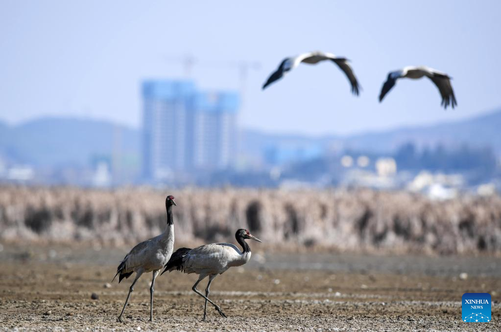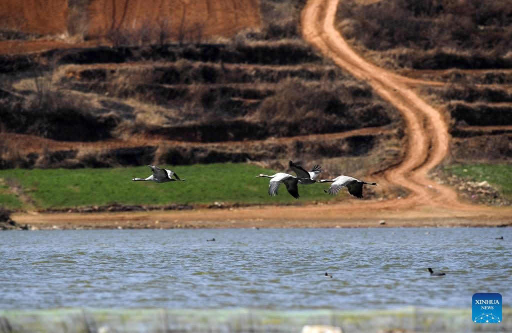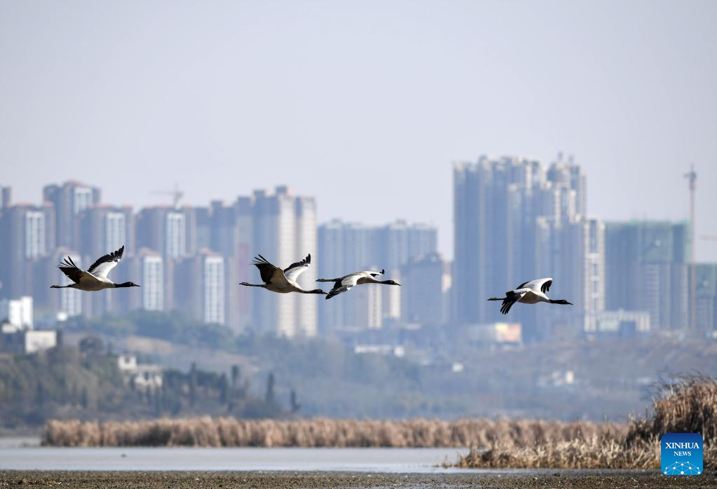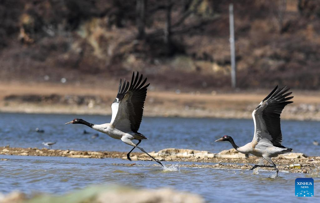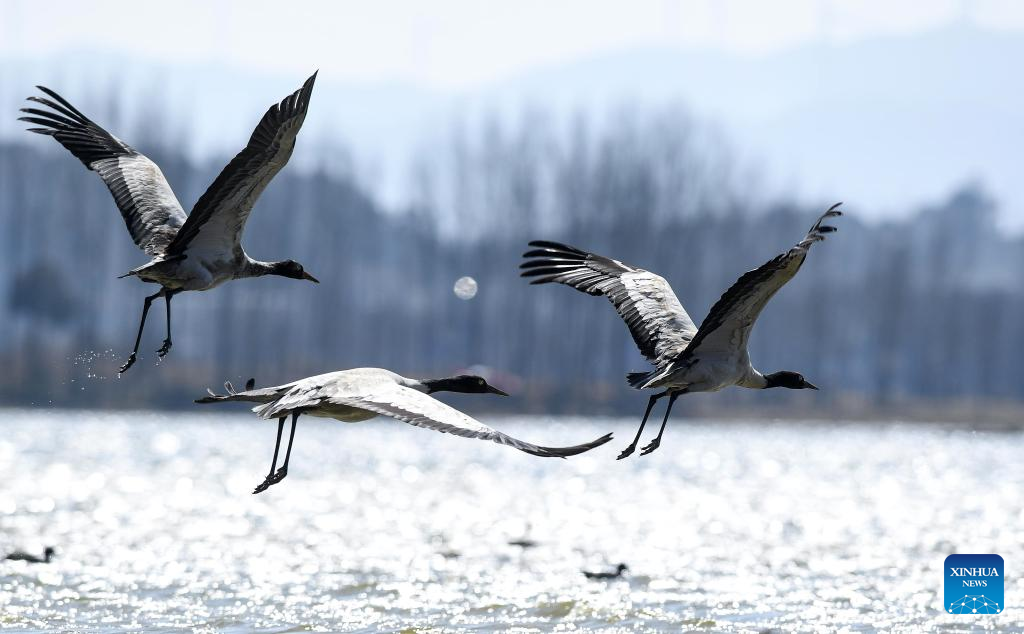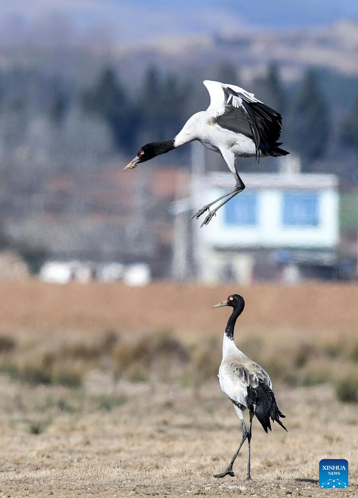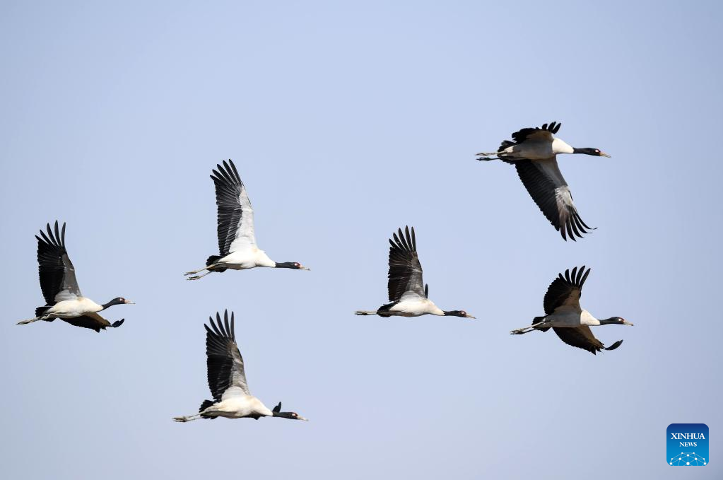Black-necked cranes fly at the Caohai National Nature Reserve in the Yi, Hui and Miao Autonomous County of Weining, southwest China's Guizhou Province, Feb. 10, 2023.