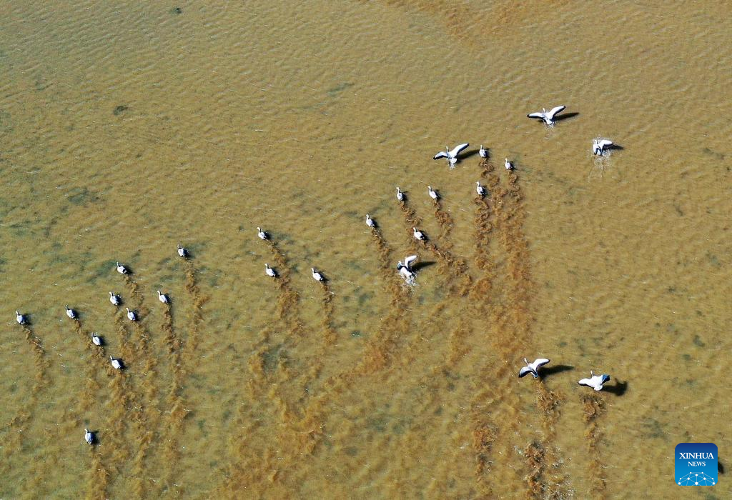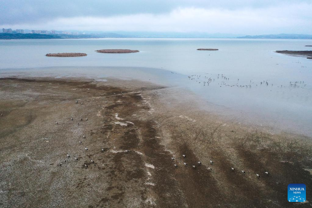 This aerial photo shows migrant birds foraging at the Caohai National Nature Reserve in the Yi, Hui and Miao Autonomous County of Weining, southwest China's Guizhou Province, Feb. 10, 2023.