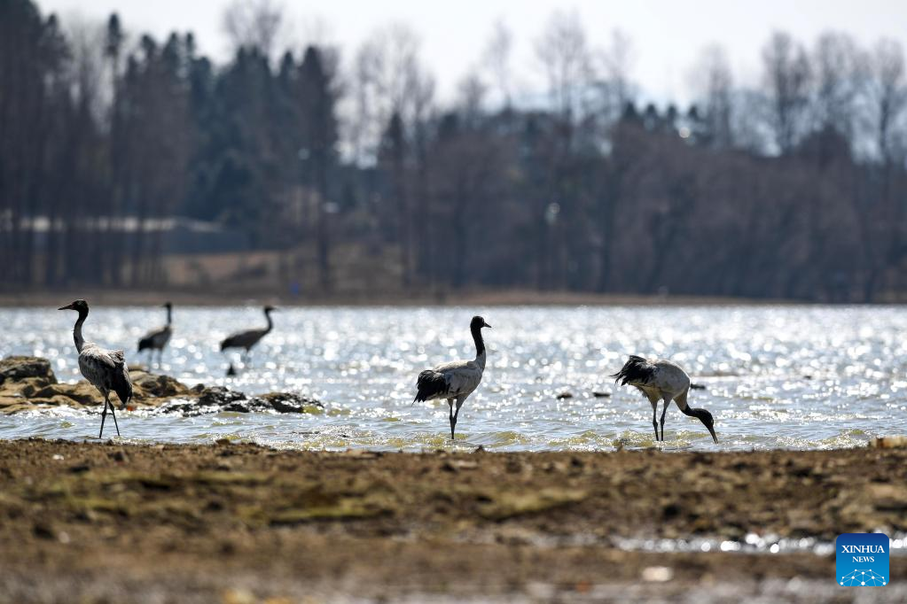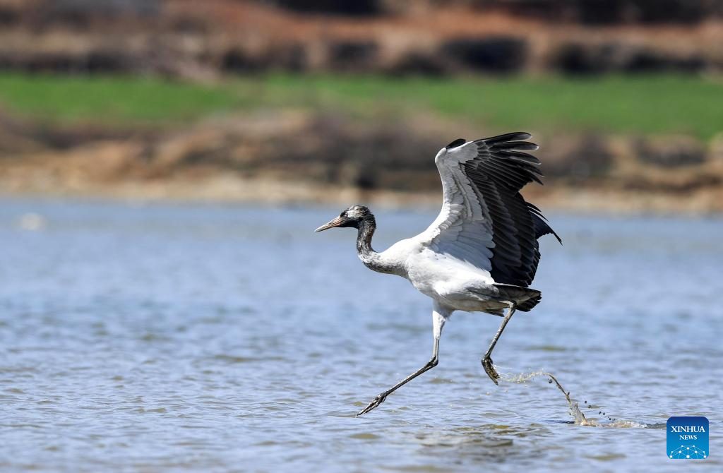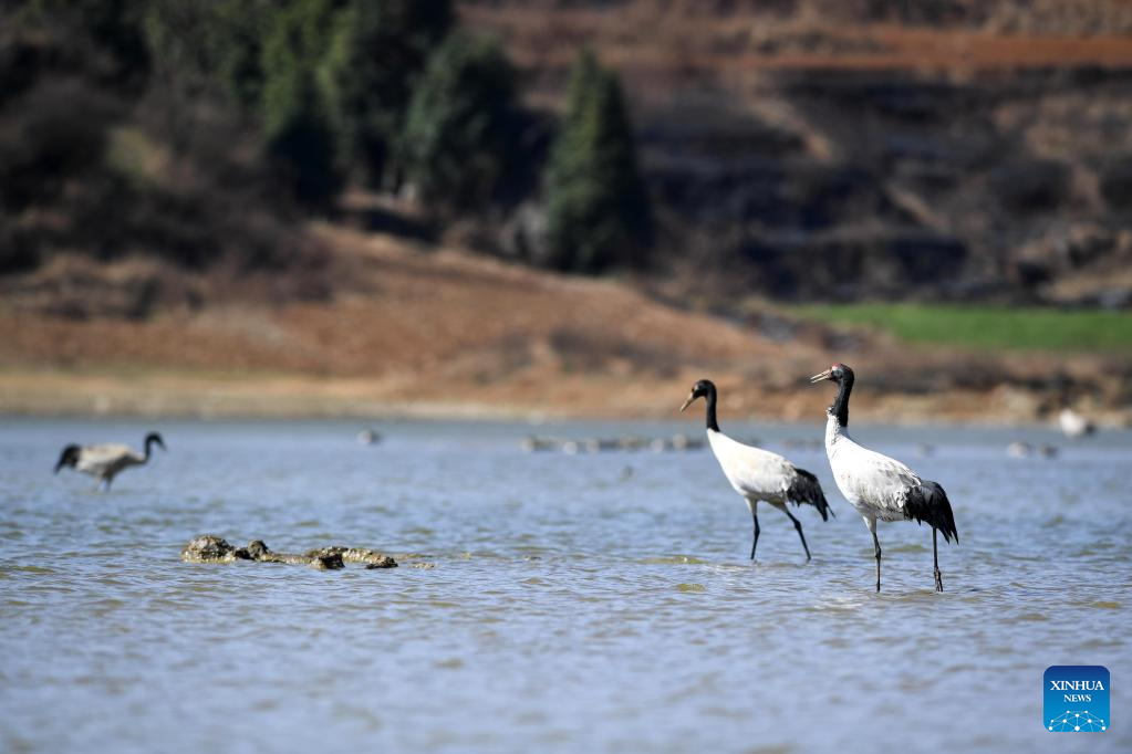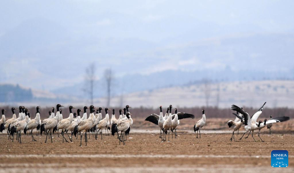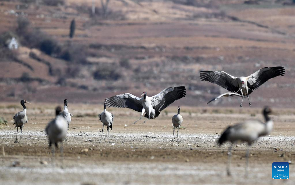 Over the years, the populations and types of wintering rare bird species in the Caohai reserve have increased. The reserve is now home to over 100,000 wintering migratory birds, including grey cranes, bar-headed geese, and black-necked cranes, among other species. The number of wintering black-necked cranes has reached 2,588. (Xinhua/Yang Wenbin)