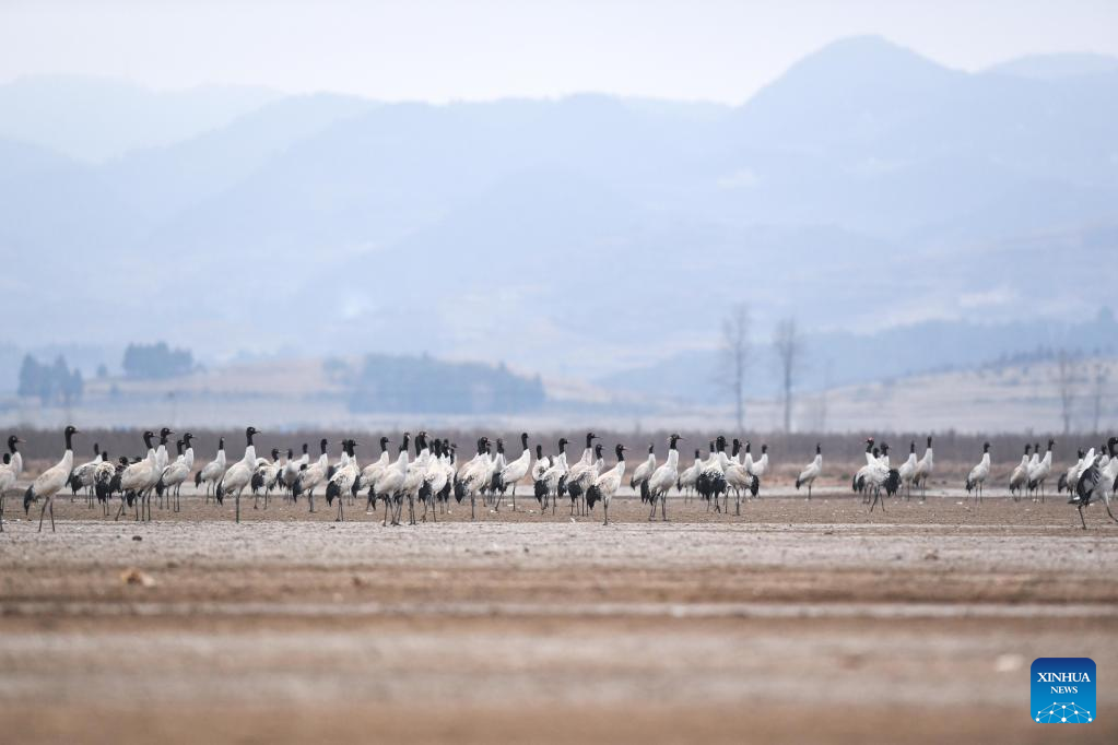 Over the years, the populations and types of wintering rare bird species in the Caohai reserve have increased. The reserve is now home to over 100,000 wintering migratory birds, including grey cranes, bar-headed geese, and black-necked cranes, among other species. The number of wintering black-necked cranes has reached 2,588. (Photo by Shen Guangyong/Xinhua)