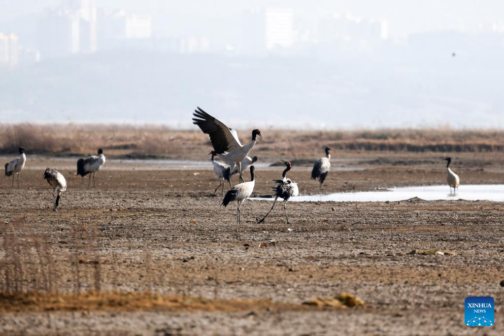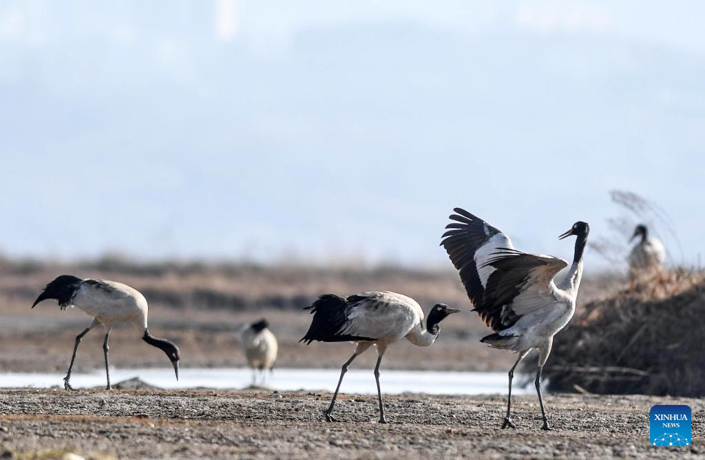 Black-necked cranes forage at the Caohai National Nature Reserve in the Yi, Hui and Miao Autonomous County of Weining, southwest China's Guizhou Province, Feb. 10, 2023.