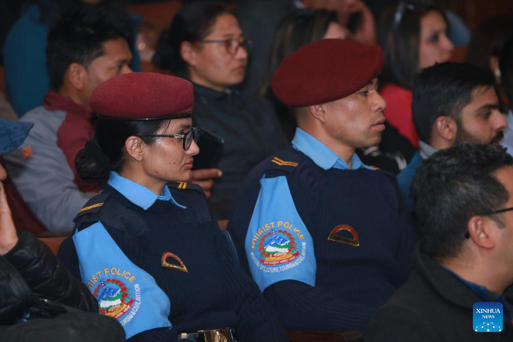 Tourism police officers as new learners attend the inaugural ceremony of the 5th Chinese language training course for Nepalese tourism professionals in Kathmandu, Nepal, Feb. 10, 2023. (Photo by Hari Maharjan/Xinhua)