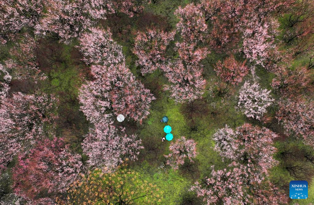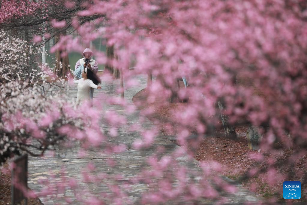 People enjoy plum blossoms at Jishou University in Xiangxi Tujia and Miao Autonomous Prefecture, central China's Hunan Province, Feb. 11, 2023. (Photo by Peng Biao/Xinhua)