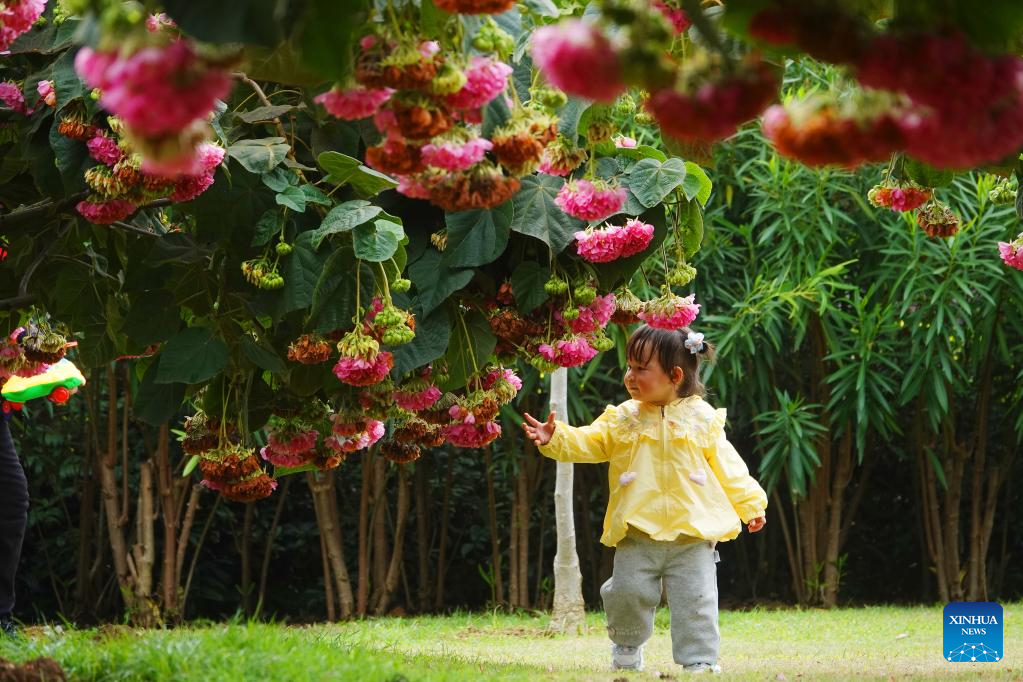 A child plays among flowers at Nanhu Park in Nanning, south China's Guangxi Zhuang Autonomous Region, Feb. 11, 2023. (Photo by Yu Xiangquan/Xinhua)