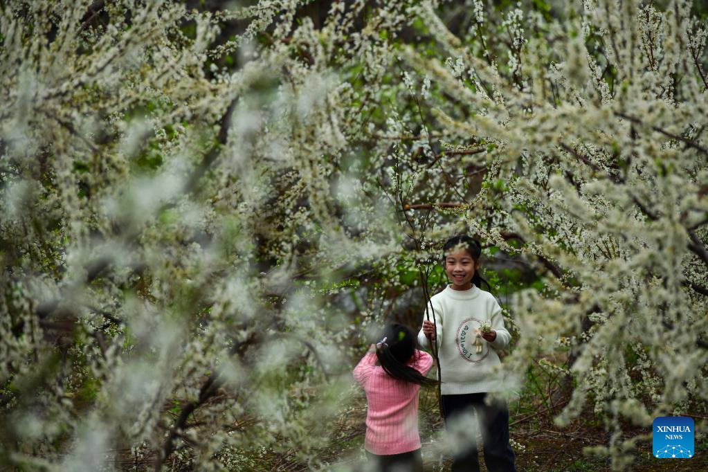 Children play among flowers on Daling Mountain in Gongcheng Yao Autonomous County of Guilin, south China's Guangxi Zhuang Autonomous Region, Feb. 11, 2023. (Photo by Jiang Keqing/Xinhua)