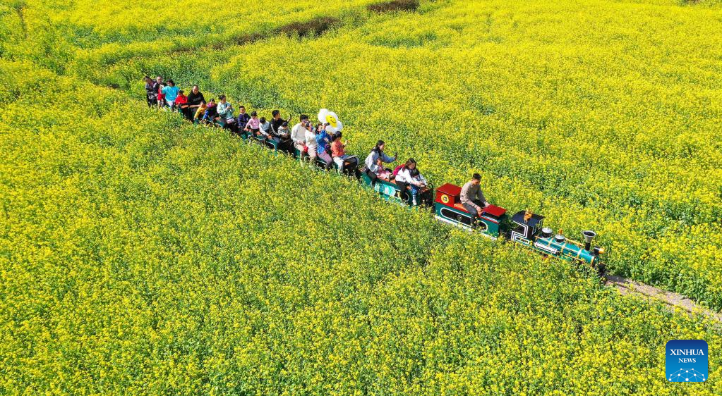 This aerial photo taken on Feb. 11, 2023 shows tourists taking a train to view cole flowers in Xingyi City of Qianxinan Buyi and Miao Autonomous Prefecture, southwest China's Guizhou Province. (Photo by Liu Chaofu/Xinhua)