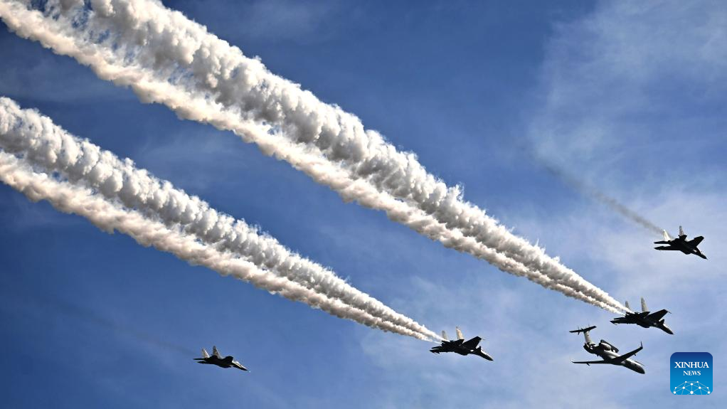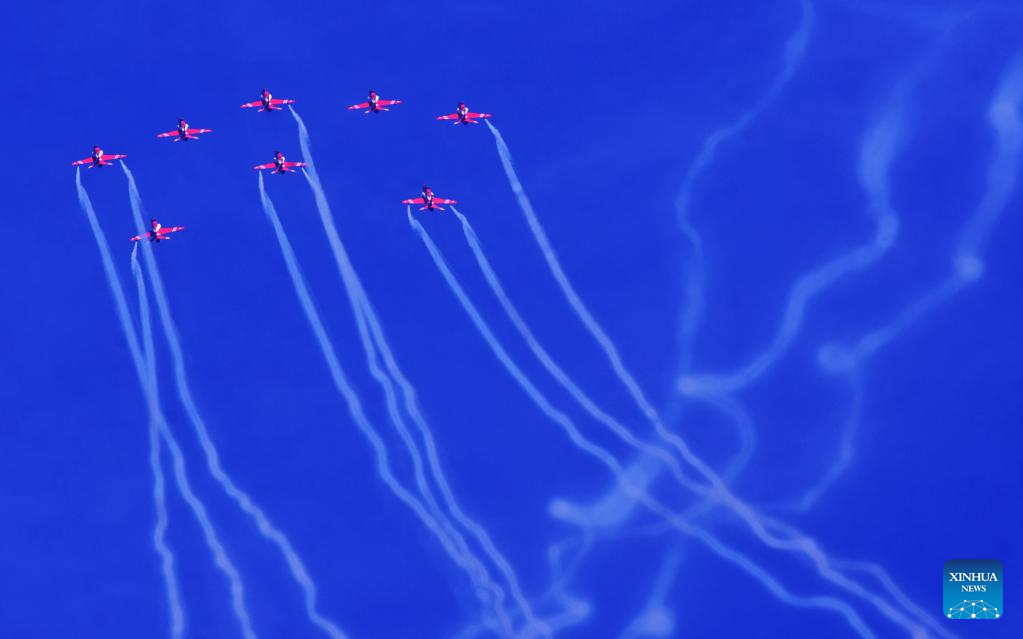 Aircraft perform during the full dress rehearsal of the Aero India 2023 at Yelahanka air base in Bengaluru, India, Feb. 11, 2023. The event will be held here from Feb. 13 to 17 this year. (Str/Xinhua)
