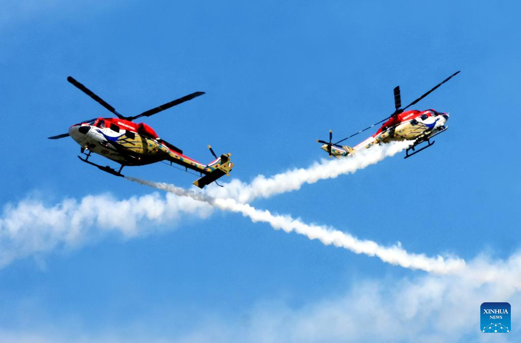 Indian Air Force's Sarang helicopters perform aerobatic maneuvers during the full dress rehearsal of the Aero India 2023 at Yelahanka air base in Bengaluru, India, Feb. 11, 2023. The event will be held here from Feb. 13 to 17 this year. (Str/Xinhua)