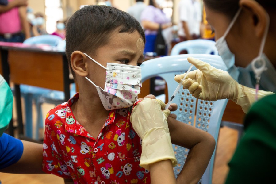 A child receives a shot of COVID-19 vaccine in Yangon, Myanmar, Sept. 16, 2022. (Photo by Myo Kyaw Soe/Xinhua)