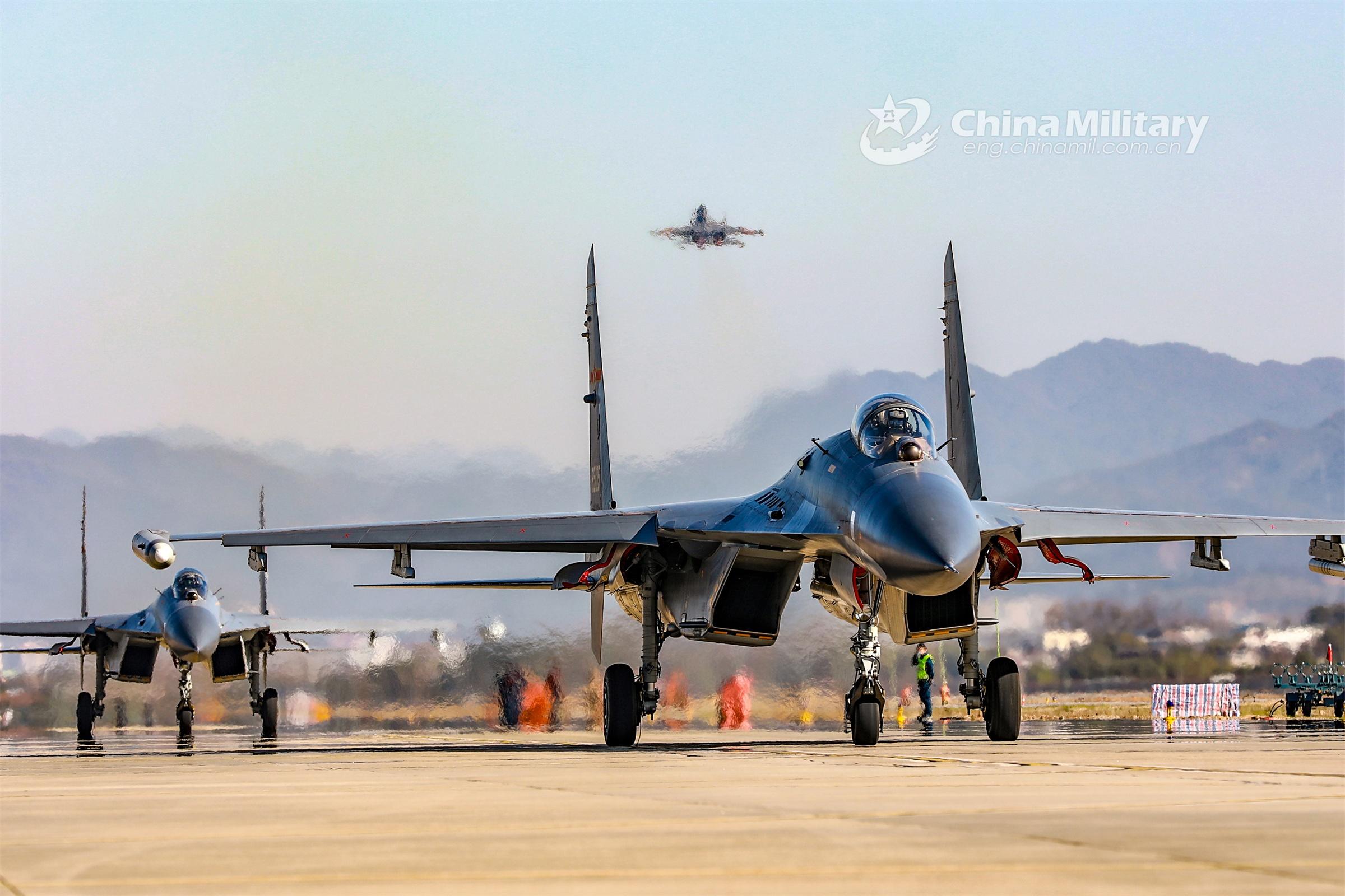 Fighter jets attached to an aviation brigade of the air force under the PLA Eastern Theater Command taxi in close formation on the flightline before takeoff for a round-the-clock flight training exercise in early February,2023. (eng.chinamil.com.cn/Photo by Fu Gan)