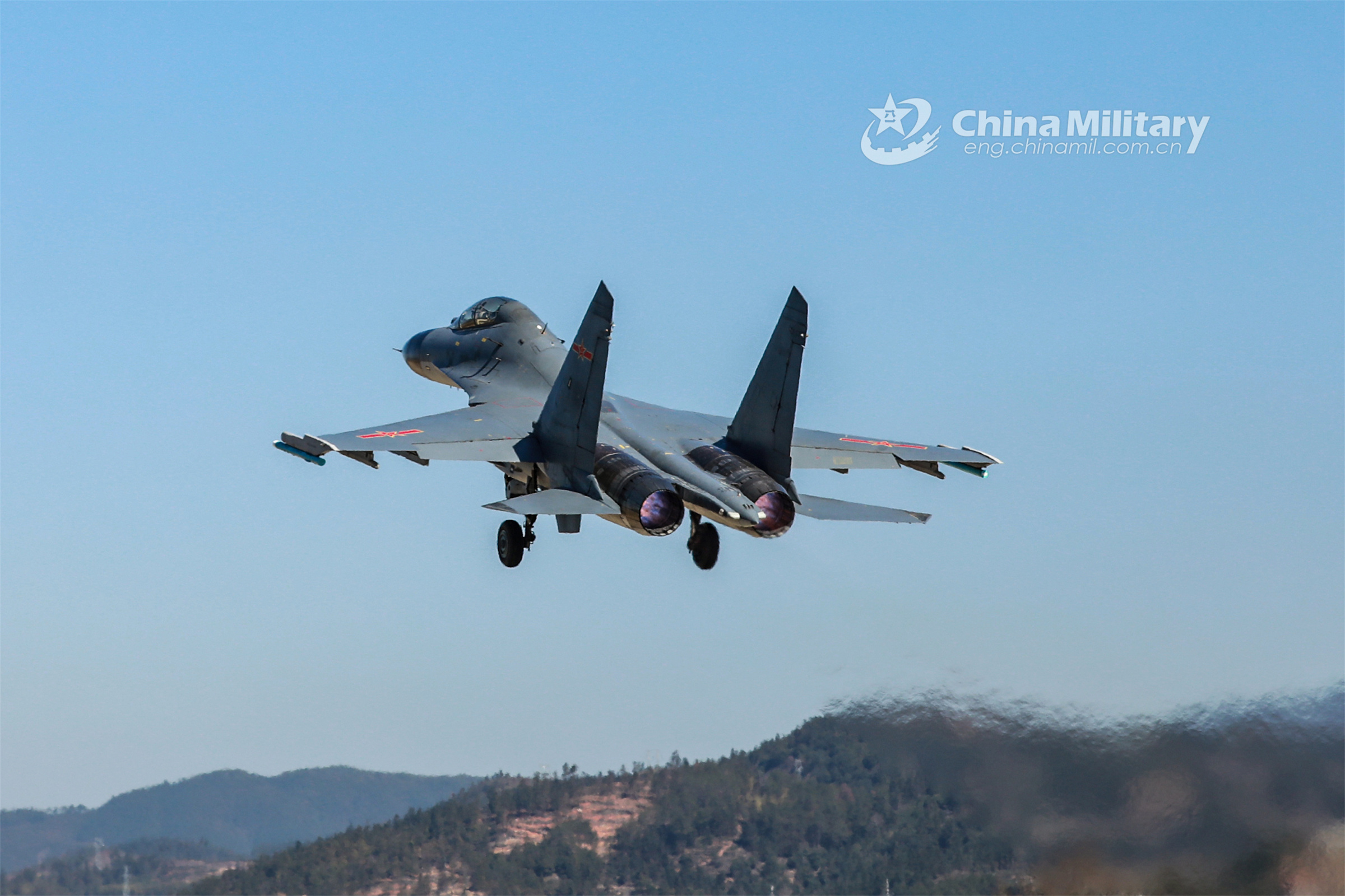 A fighter jet attached to an aviation brigade of the air force under the PLA Eastern Theater Command soars into the air during a round-the-clock flight training exercise in early February, 2023. (eng.chinamil.com.cn/Photo by Fu Gan)