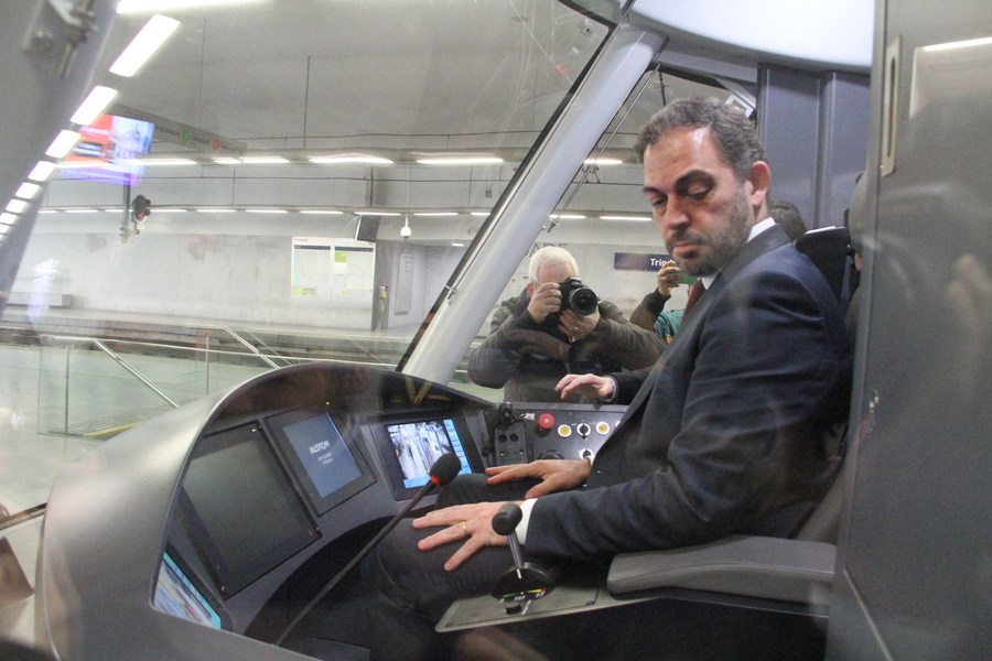 Portuguese Minister of Environment and Climate Action Duarte Cordeiro (C) sits in the driver's cab of a China-made metro train inside the Trindade Metro Station at the center of Porto, Portugal, Feb. 11, 2023. (Xinhua/Wen Xinnian)