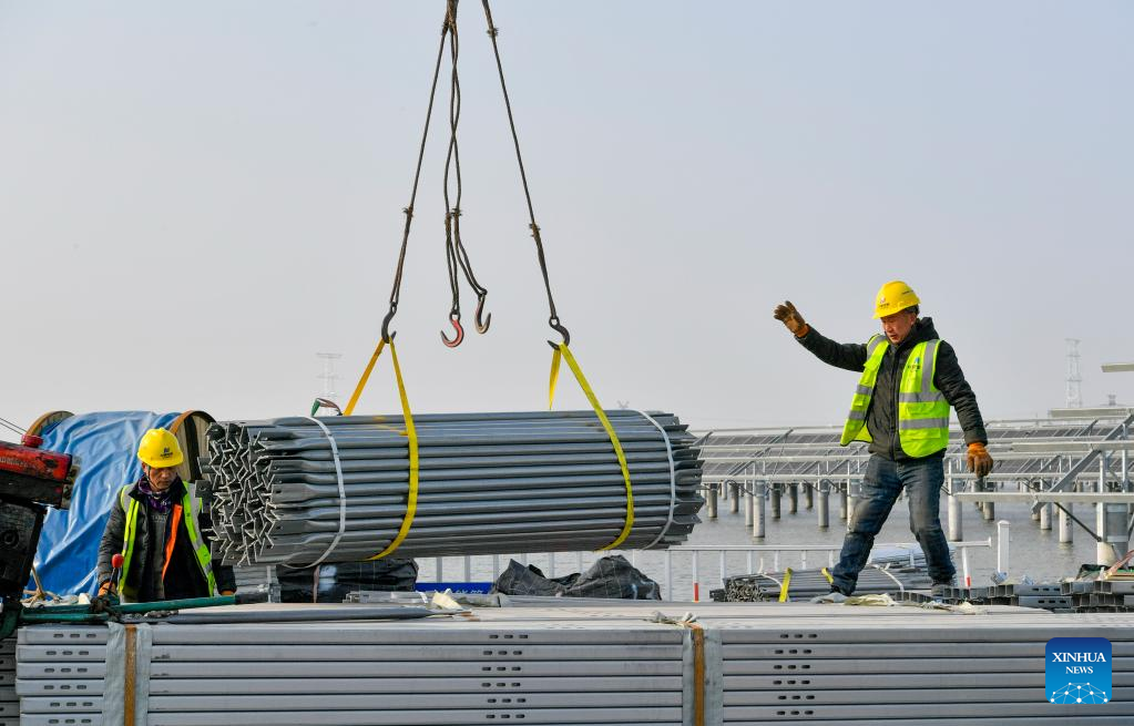 A constructor directs as the components of photovoltaic (PV) panels are lifted at the construction site of a PV power project at a sea crystal salt field in north China's Tianjin, Feb. 7, 2023. Tianjin Municipality has announced 673 key construction projects in 2023, with a total investment of 1.53 trillion yuan (about 224.8 billion U.S. dollars). (Xinhua/Sun Fanyue)