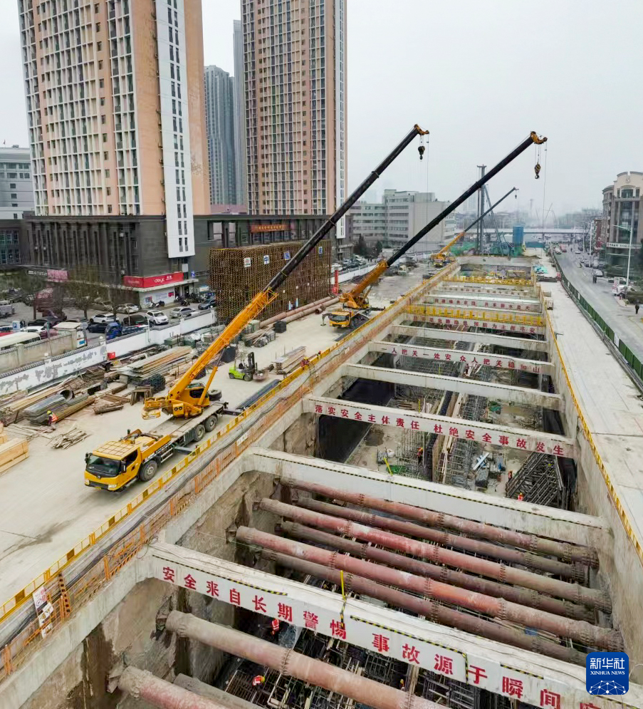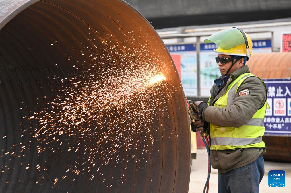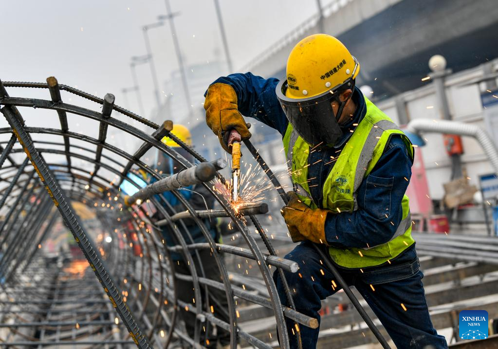A constructor works at the construction site of a section of Tianjin Rail Transit Line 8 in north China's Tianjin, Feb. 11, 2023. Tianjin Municipality has announced 673 key construction projects in 2023, with a total investment of 1.53 trillion yuan (about 224.8 billion U.S. dollars). (Xinhua/Sun Fanyue)