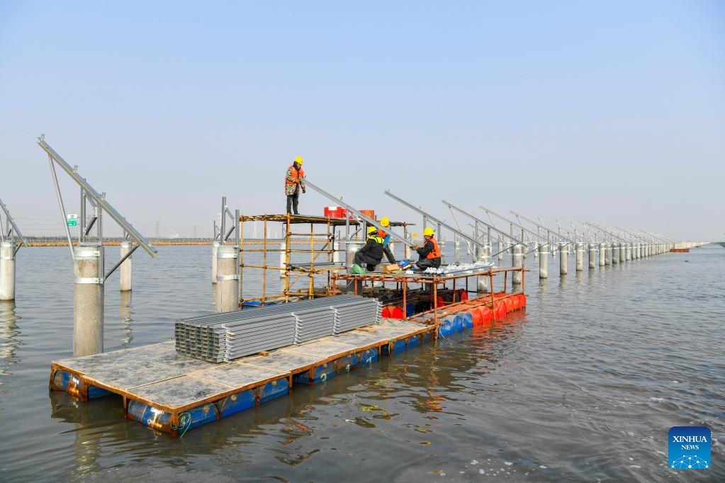 Constructors install the components of photovoltaic (PV) panels at the construction site of a PV power project at a sea crystal salt field in north China's Tianjin, Feb. 7, 2023. Tianjin Municipality has announced 673 key construction projects in 2023, with a total investment of 1.53 trillion yuan (about 224.8 billion U.S. dollars). (Xinhua/Sun Fanyue)