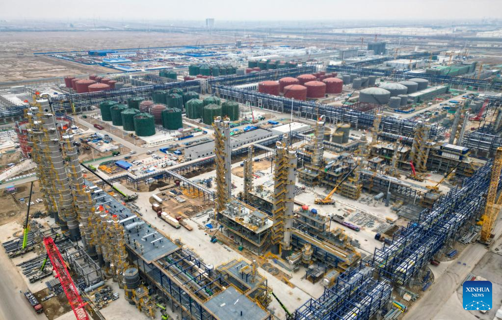This aerial photo shows the construction site of an ethylene project in north China's Tianjin, Feb. 9, 2023. Tianjin Municipality has announced 673 key construction projects in 2023, with a total investment of 1.53 trillion yuan (about 224.8 billion U.S. dollars). (Xinhua/Sun Fanyue)