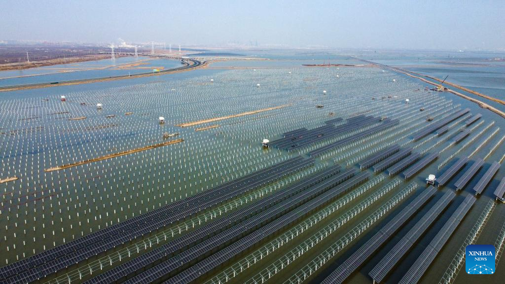 This aerial photo shows the construction site of a photovoltaic (PV) power project in north China's Tianjin, Feb. 7, 2023. Tianjin Municipality has announced 673 key construction projects in 2023, with a total investment of 1.53 trillion yuan (about 224.8 billion U.S. dollars). (Xinhua/Sun Fanyue)