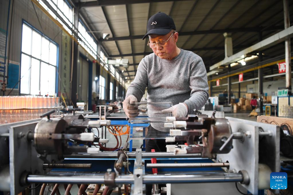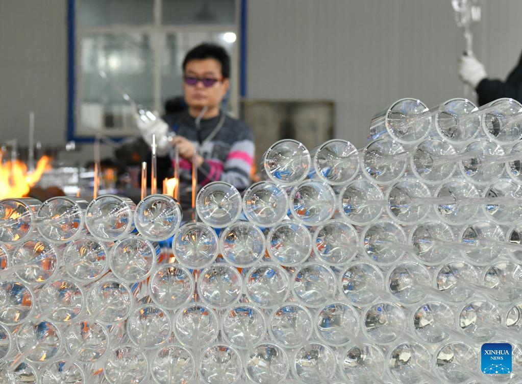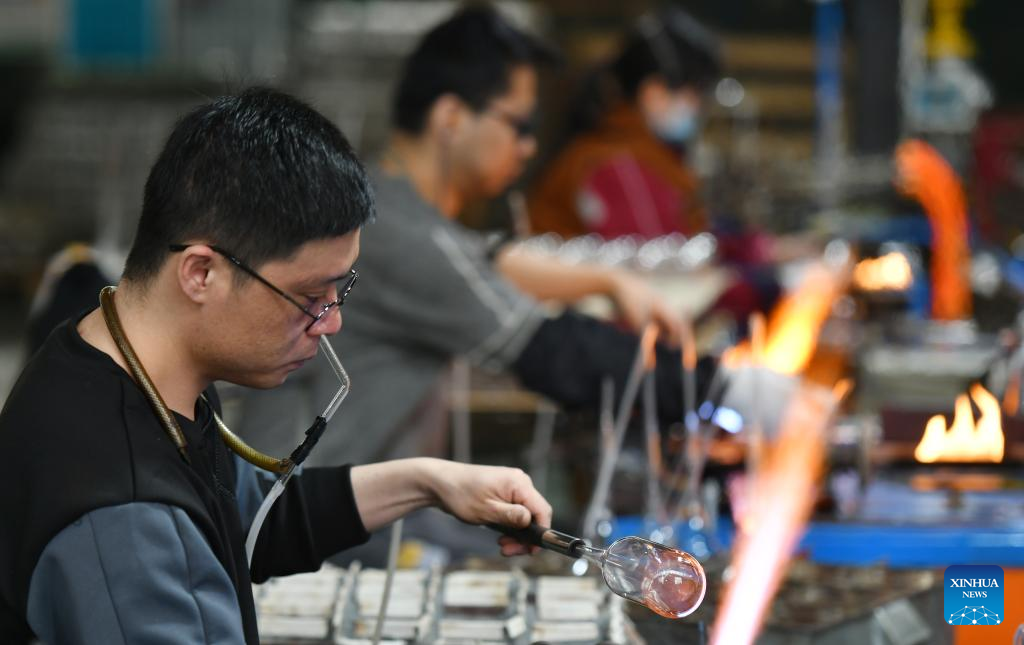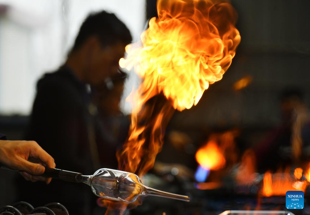 A worker makes a piece of glasswork at the workshop of a company in Hejian City, north China's Hebei Province, Feb. 11, 2023. Hejian City is famous for its glasswork making industry. Now, there are more than 200 glasswork making companies and over 60,000 staff members involved in the industry in Hejian. The annual output of the glasswork reached nearly 10 billion yuan (about 1.47 billion U.S. dollars) and the glasswork has been exported to over 50 countries and regions. (Xinhua/Mu Yu)