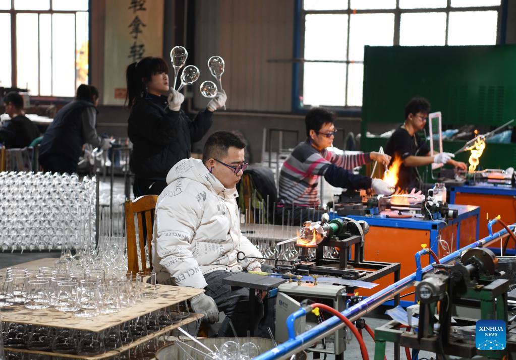 Workers make glasswork at the workshop of a company in Hejian City, north China's Hebei Province, Feb. 11, 2023. Hejian City is famous for its glasswork making industry. Now, there are more than 200 glasswork making companies and over 60,000 staff members involved in the industry in Hejian. The annual output of the glasswork reached nearly 10 billion yuan (about 1.47 billion U.S. dollars) and the glasswork has been exported to over 50 countries and regions. (Xinhua/Mu Yu)