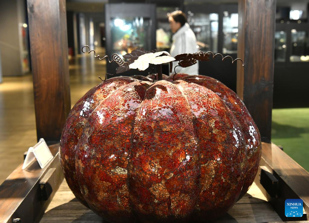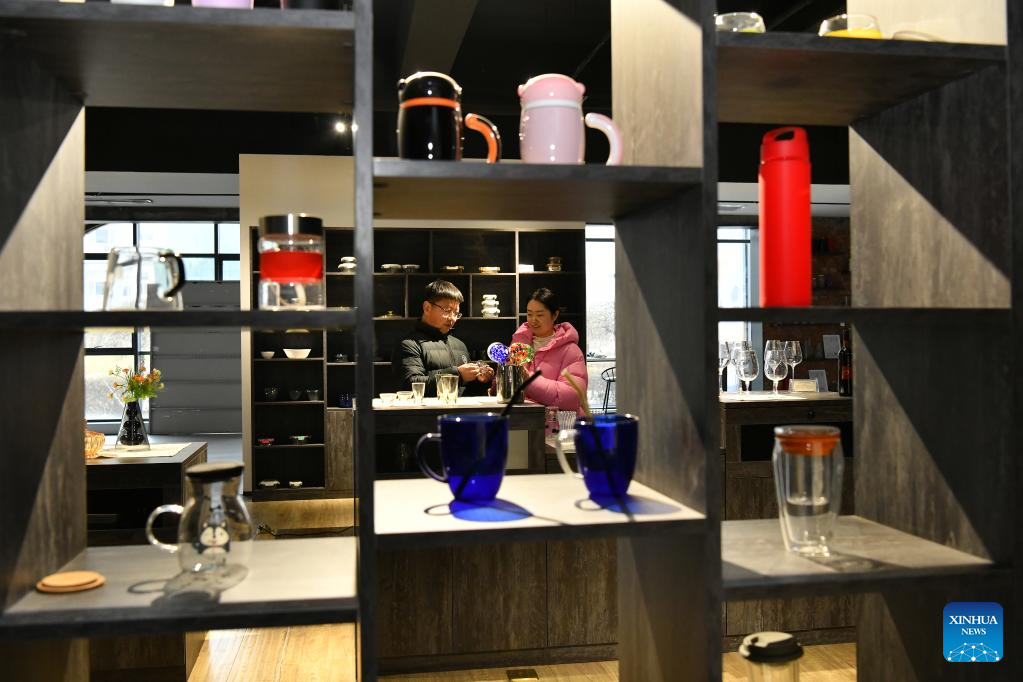 A merchant visits the exhibition hall of a glasswork company in Hejian City, north China's Hebei Province, Feb. 11, 2023. Hejian City is famous for its glasswork making industry. Now, there are more than 200 glasswork making companies and over 60,000 staff members involved in the industry in Hejian. The annual output of the glasswork reached nearly 10 billion yuan (about 1.47 billion U.S. dollars) and the glasswork has been exported to over 50 countries and regions. (Xinhua/Mu Yu)