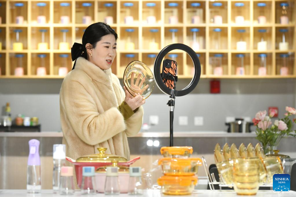 A staff member presents glasswork via livestreaming at a company in Hejian City, north China's Hebei Province, Feb. 11, 2023. Hejian City is famous for its glasswork making industry. Now, there are more than 200 glasswork making companies and over 60,000 staff members involved in the industry in Hejian. The annual output of the glasswork reached nearly 10 billion yuan (about 1.47 billion U.S. dollars) and the glasswork has been exported to over 50 countries and regions. (Xinhua/Mu Yu)